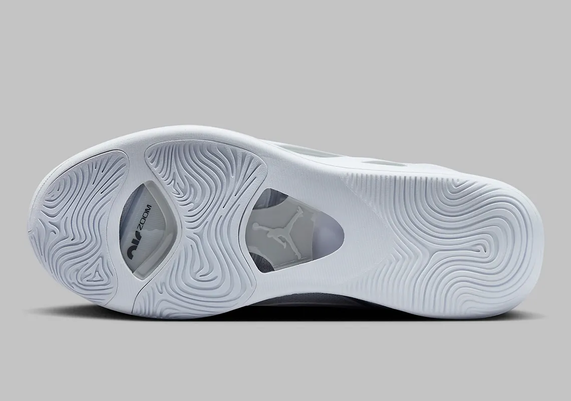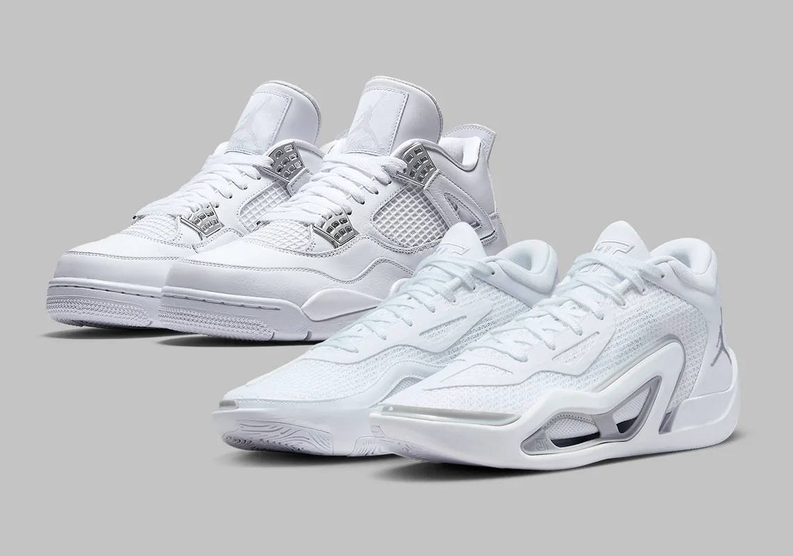 On y retrouve une tige 100% blanche sur les parties en mesh et en cuir. Les touches de gris, au niveau de la semelle ou sur le « Jumpman » font référence aux œillets argentés de la AJ 4.