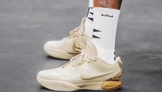Le modèle est habillé d’un premier coloris beige avec un « Swoosh » bien bombé sur l’empeigne et des finitions en doré. La première étape est enclenchée en attendant la suite pour cette LeBron 21 qui pourrait investir le marché pour la fin septembre.