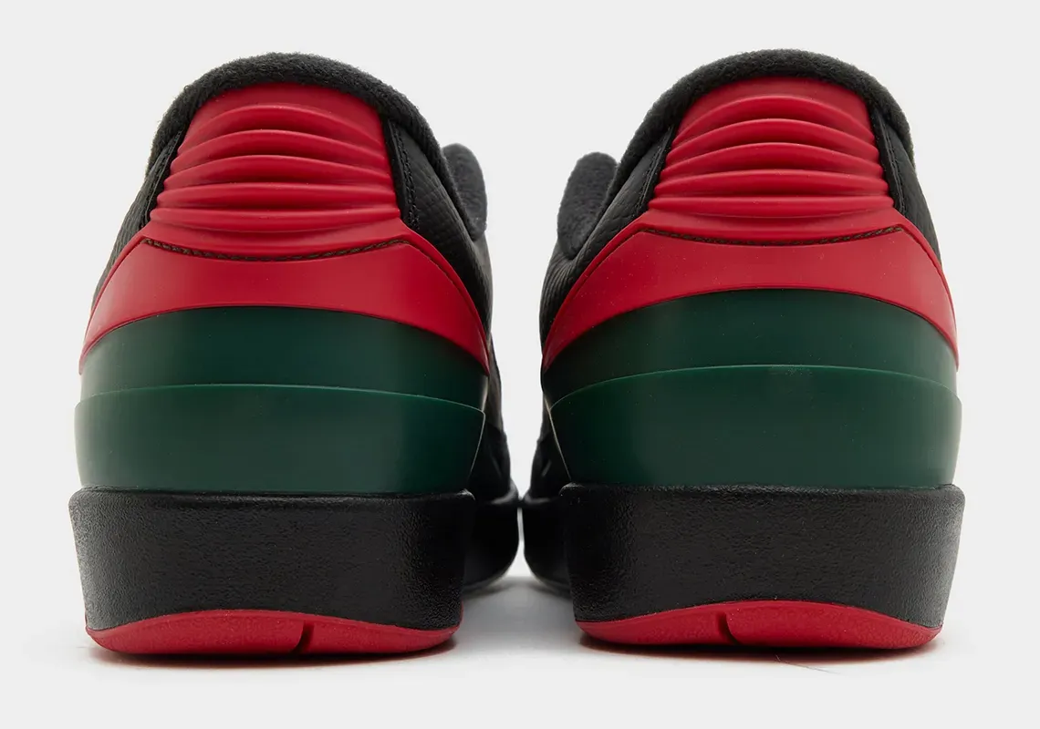 Pourquoi ce clin d’œil ? Car à l'origine, la AJ 2 se voulait un modèle haut de gamme et sa fabrication s'était alors installée de l'autre côté des Alpes. La tige en cuir noir est ainsi complétée de bandes vertes sur sa base arrière, tandis que des finitions en rouge bonifient l'ensemble, sur le logo « Air Jordan » présent sur la languette notamment.
