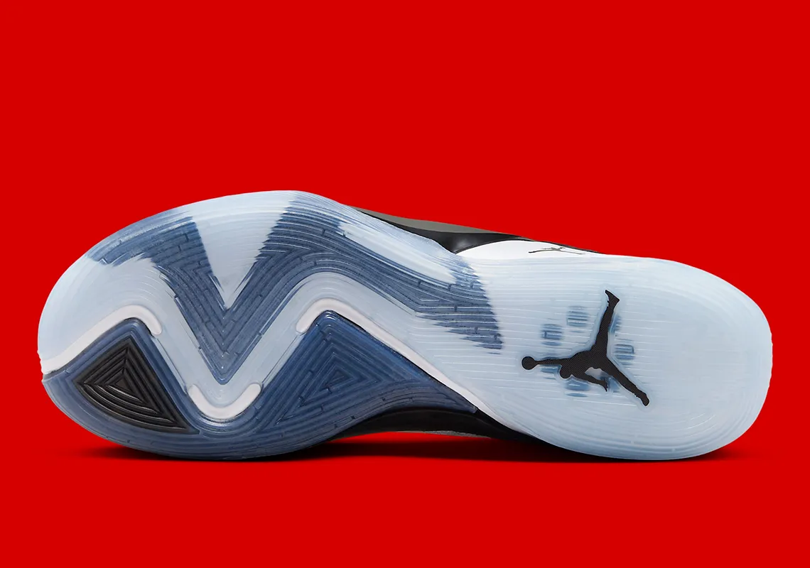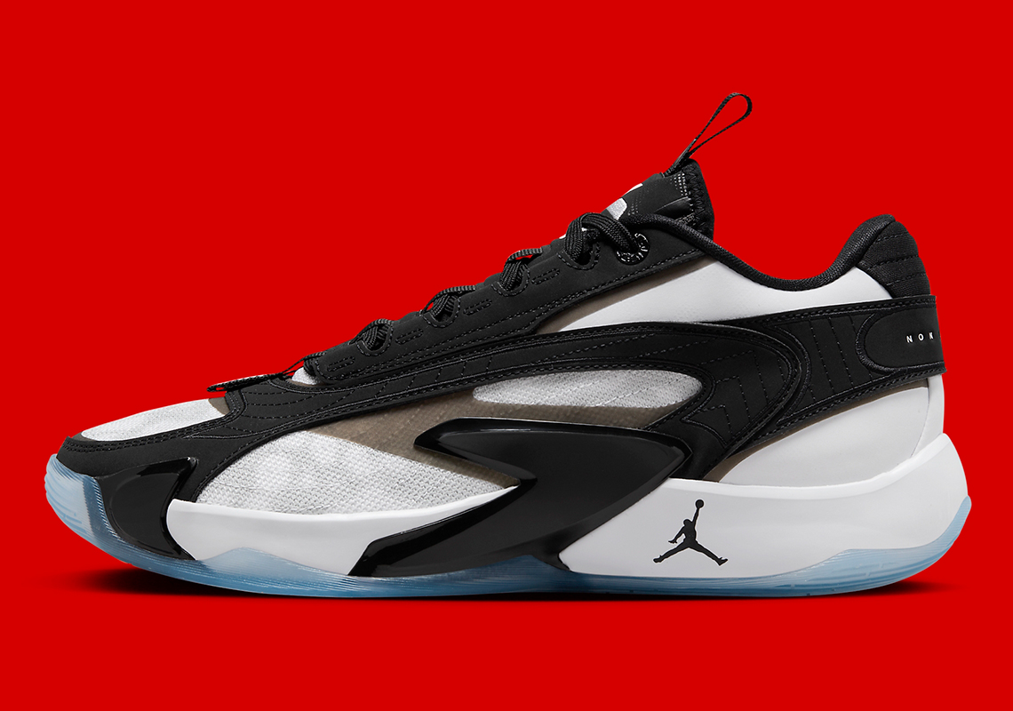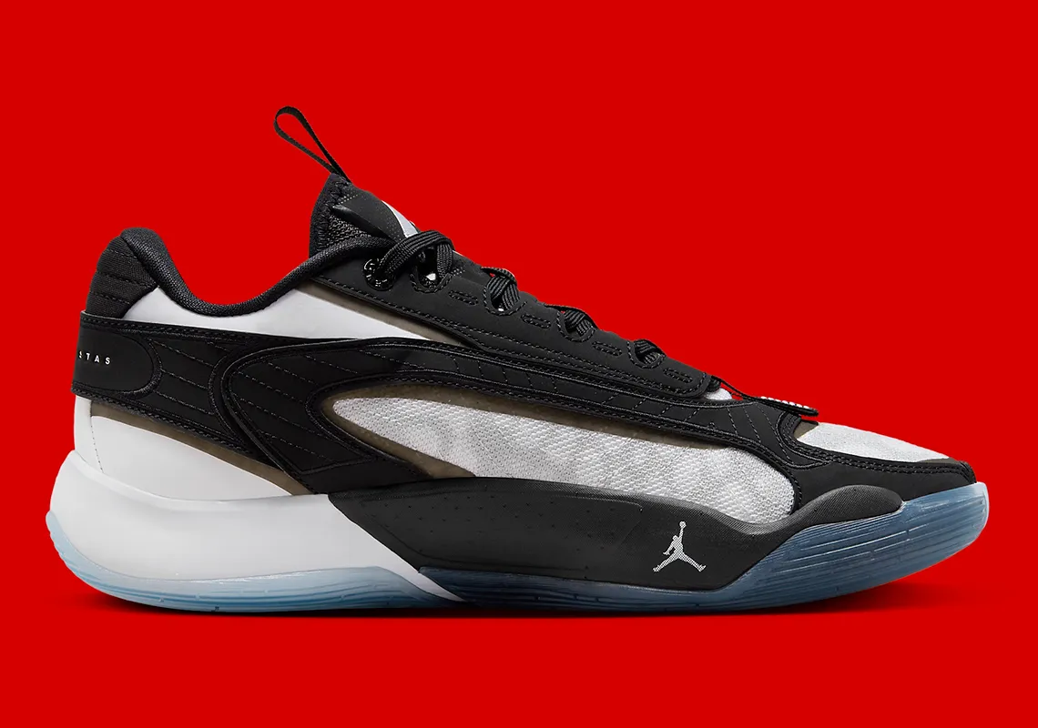 La base de la tige en mesh blanc est recouverte de bandes noires. La languette, noire elle aussi, fait ressortir le logo de Luka Doncic en blanc. Même chose pour son leitmotiv en latin «non desistas non exieris» (« N’abandonne pas, ne te rend pas »), au niveau du talon. La semelle extérieure en noir et blanc repose quant à elle sur une semelle extérieure en caoutchouc bleu translucide.