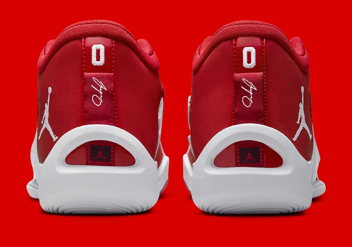 La tige est en effet principalement dans un rouge « University Red », avec seuls les logos JT et le Jumpman ressortant en blanc. Même chose pour le numéro 0 et la signature de Jayson Tatum sur le talon. L'ensemble repose sur une semelle également blanche.