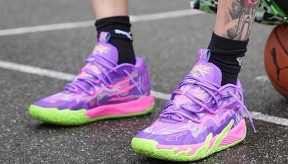 Dans la lignée des modèles « flashy » qui ont fait le succès de la collection «MB » de Puma, ce coloris offre plusieurs tons de violet et rose pour habiller sa tige, le tout complété par une semelle en rose et vert fluo qui ne passe pas inaperçue.