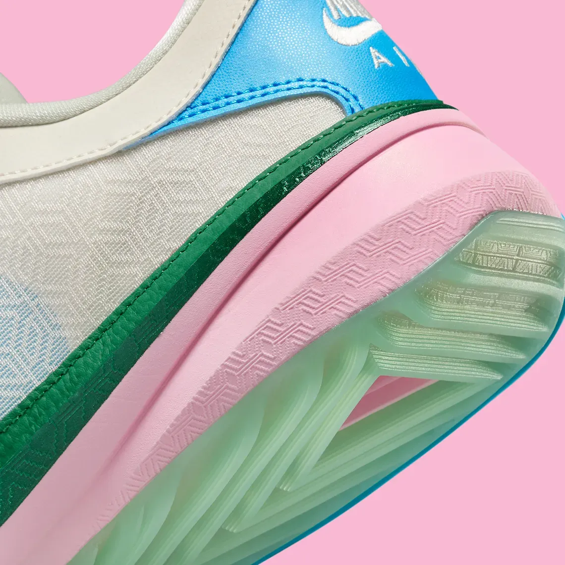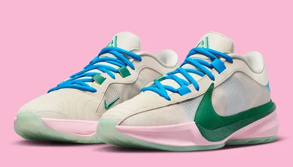 La tige beige est contrastée par le gros Swoosh couleur vert Bucks, les lacets en bleu ciel et la semelle intermédiaire rose. Le logo de Giannis Antetokounmpo apparaît également en vert sur la languette.