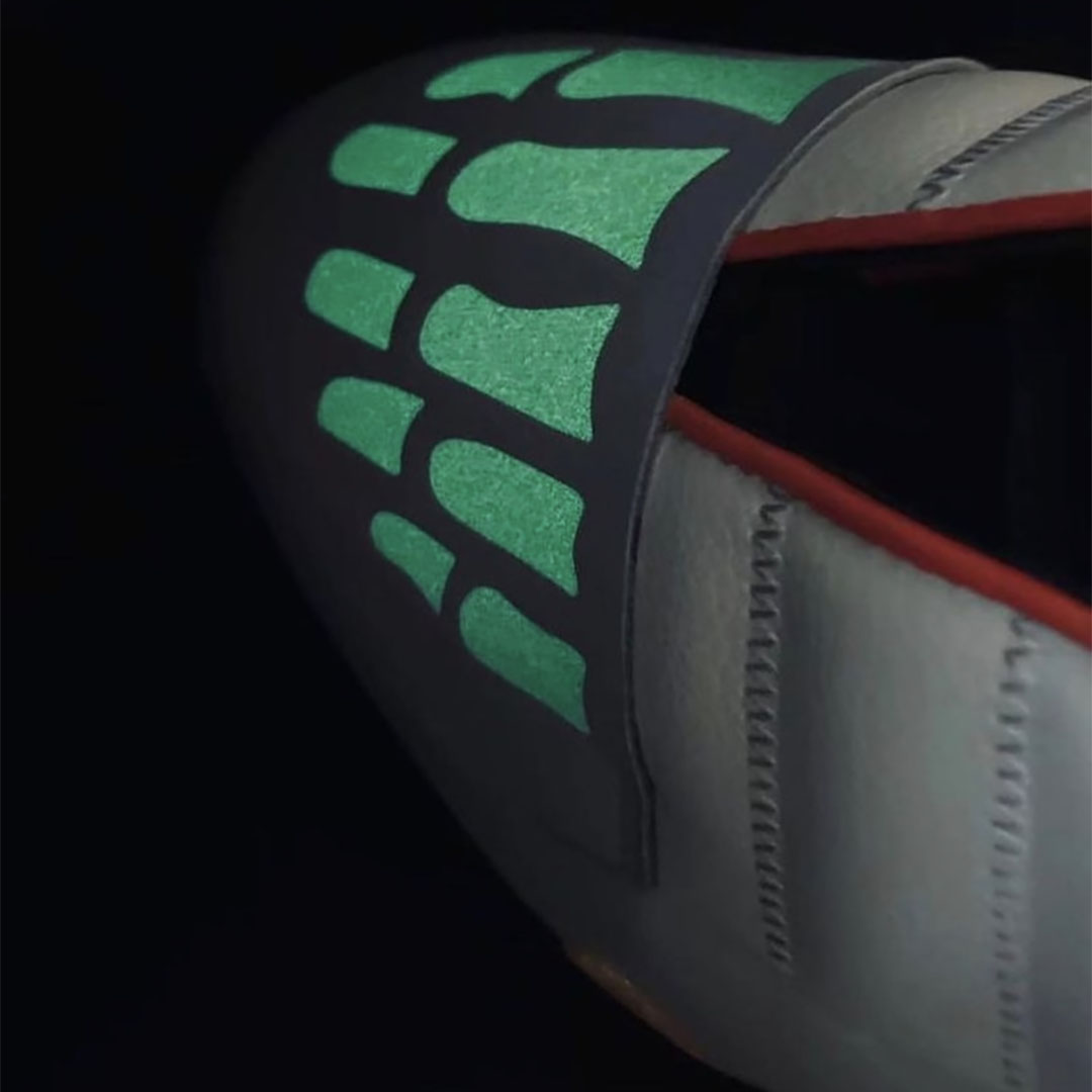 On retrouve de l’orange semblable à une citrouille sur le talon avec la silhouette d’une « Jack O’Lantern ». L’empeigne blanche laisse la place à une zone grise à l’avant du pied, sur laquelle des orteils de squelette phosphorescents apparaissent en vert dans l’obscurité.