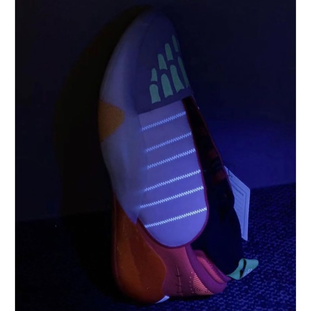 On retrouve de l’orange semblable à une citrouille sur le talon avec la silhouette d’une « Jack O’Lantern ». L’empeigne blanche laisse la place à une zone grise à l’avant du pied, sur laquelle des orteils de squelette phosphorescents apparaissent en vert dans l’obscurité.