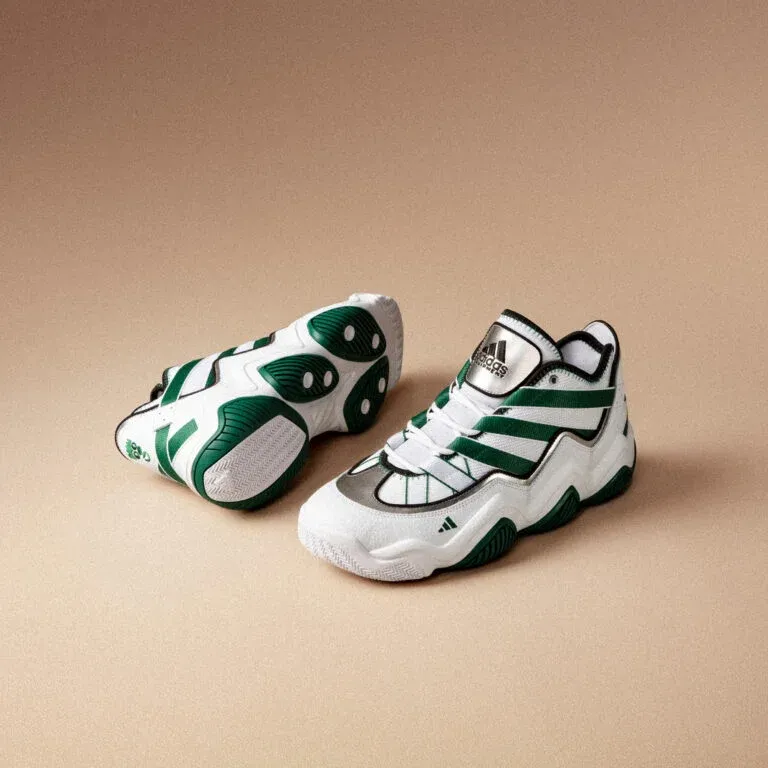 La paire est sortie sous un nouveau coloris en blanc et noir qui se distingue avec ses touches de vert sur les bandes recouvrant l'empeigne en mesh ainsi qu'au niveau de la semelle. Le logo adidas ressort en noir sur fond transparent sur la languette.