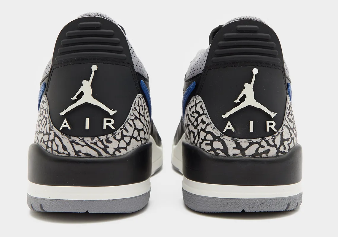 Le nouveau coloris du modèle hybride ici présenté est composé d’une tige en cuir noir avec une partie bleue à l’avant du pied, ainsi que sur l’inscription « Nike » sur le strap et le « Swoosh » sur l’empeigne. Un imprimé éléphant est également présent en noir et blanc sur la partie arrière avec un « Jumpman » blanc sur fond noir au niveau du talon. L’ensemble repose sur une semelle en blanc et gris.