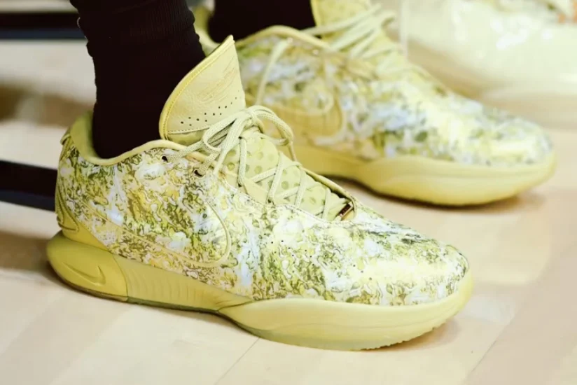 Après avoir dévoilé un modèle « Purple Rain » en hommage à Prince, l’un de ses chanteurs préférés, et donc principalement en violet, la superstar des Lakers a cette fois présenté une paire « Gold ». Quoiqu’il arrive, il sera ainsi raccord avec les couleurs « Purple & Gold » des Lakers. Sur ce modèle, la touche globale porte plutôt sur le doré, proche du vert très clair. La tige laisse aussi échapper des motifs de vert et de blanc.