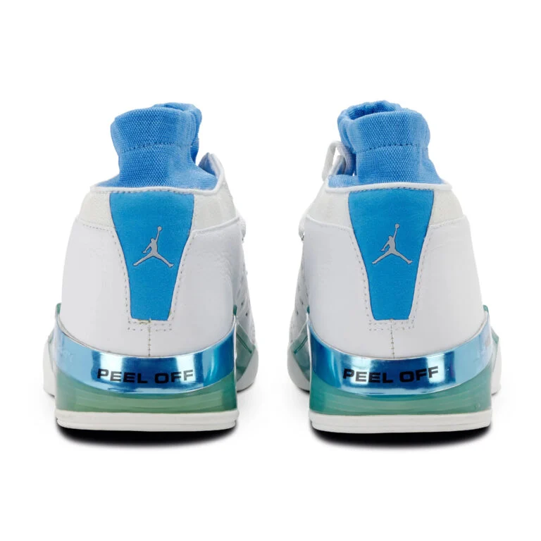 Le modèle arbore une tige en cuir blanc complétée de finitions avec le bleu emblématique de North Carolina, l’université de Michael Jordan, au niveau du col, de l’avant du pied et de la semelle intermédiaire. On retrouve également un « Jumpman » blanc sur fond bleu au niveau du talon.