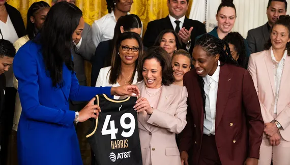 Chelsea Gray, MVP de la finale remportée face à Connecticut, et A'Ja Wilson, MVP de la saison régulière, ont ensuite remis un maillot de l'équipe à Kamala Harris avec son nom au dos et le numéro 49.