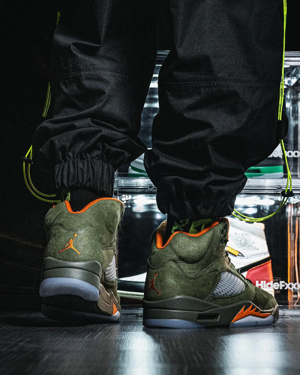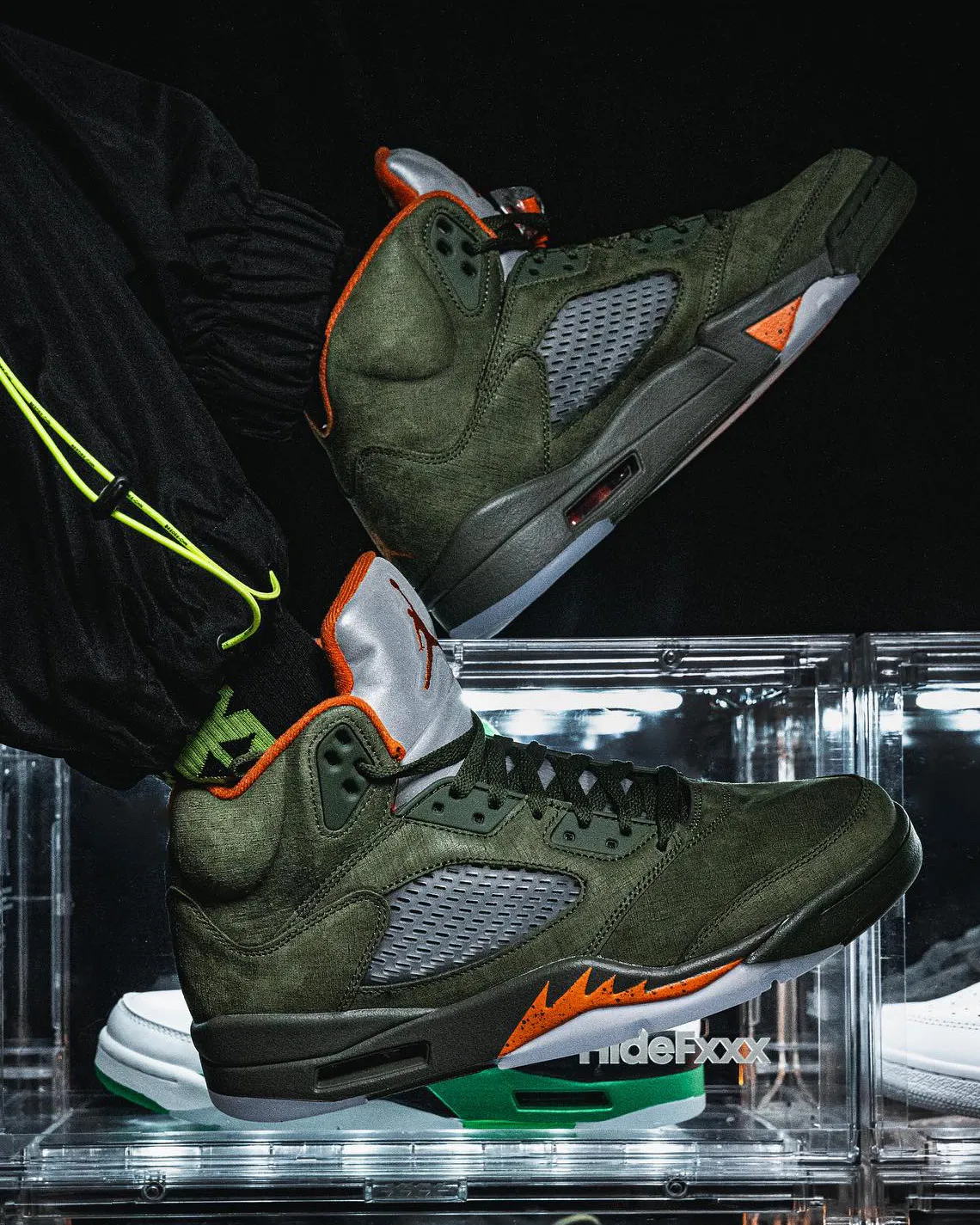 Initialement sorti en 2006, le modèle présente la même composition avec sa tige en daim « grainé » couleur olive. D’autres parties ressortent en vert foncé et l’ensemble est complété par des finitions en orange, notamment au niveau du col ou pour faire apparaître le « Jumpman » sur fond gris sur la languette.