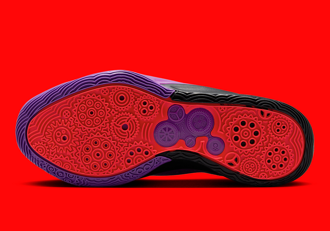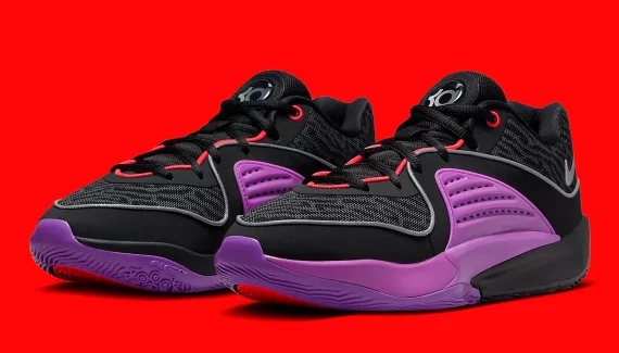 Le premier coloris devrait être ce « Black-Vivid Purple » avec une tige principalement noire agrémentée d’une touche de violet sur l’avant de la semelle intermédiaire et le renfort latéral en TPU. On note également des finitions en rouge et en gris, comme sur le « Swoosh » ou le logo « KD » présent sur la languette.