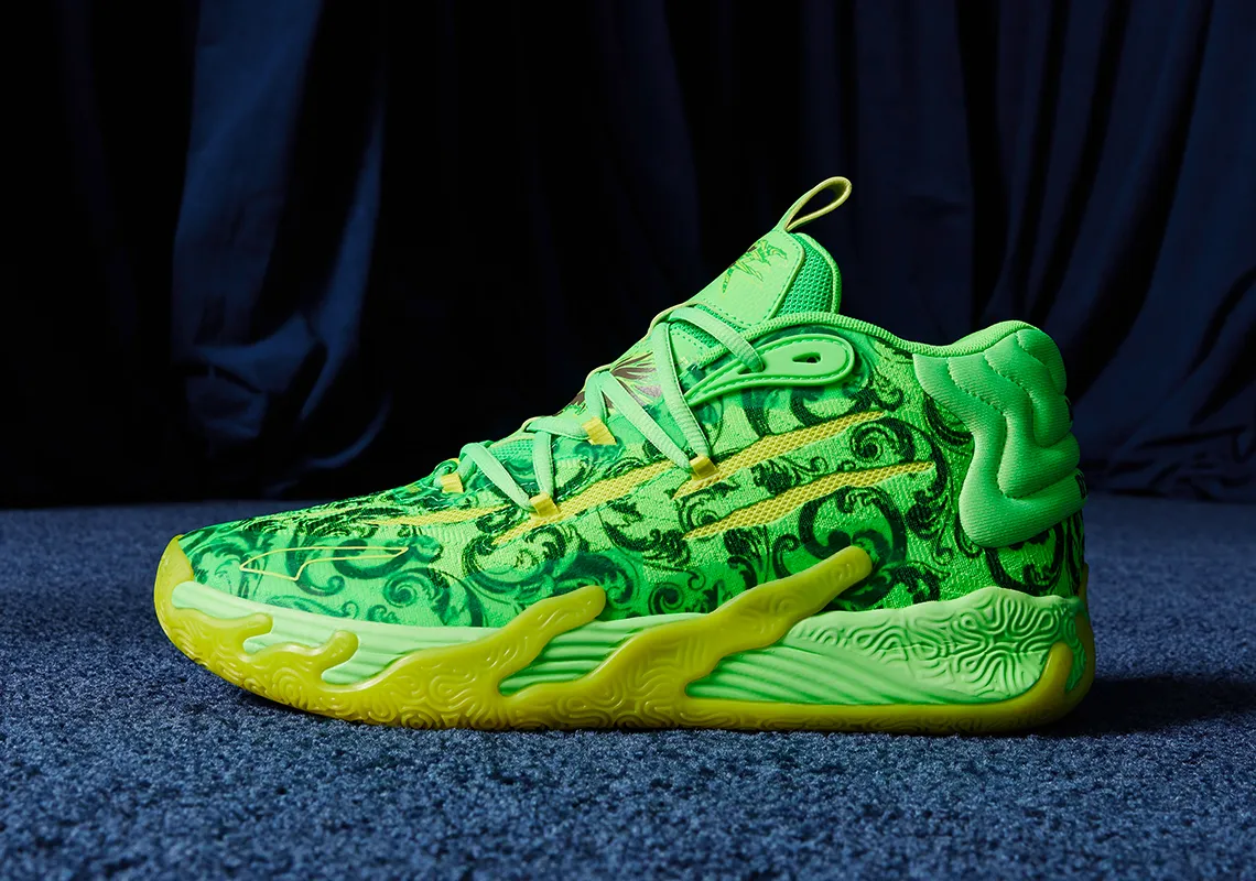 La tige de ce coloris est habillée de « Volt Green » avec des motifs au design victorien en noir. Le logo de la marque « LaFrancé » et de LaMelo Ball apparaissent également en noir au niveau de la languette notamment.