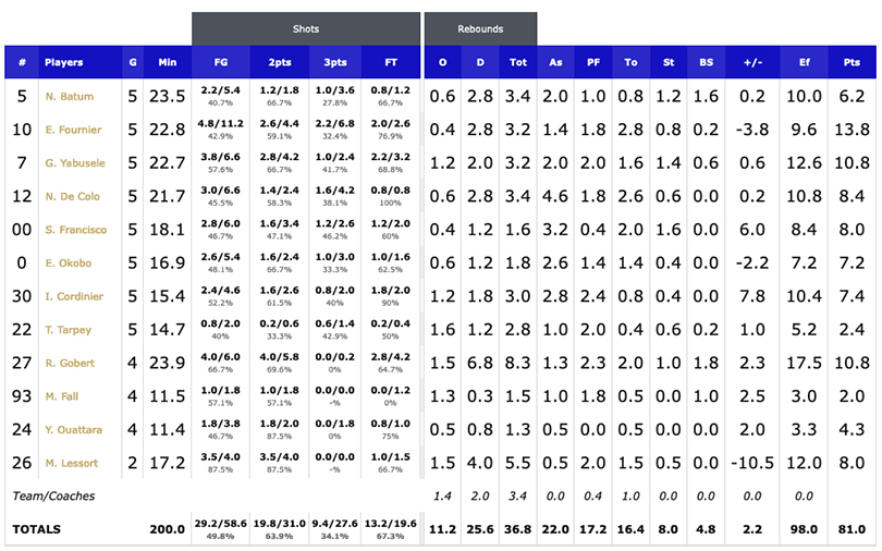 Replacé au poste 3 avec Guerschon Yabusele qui prend l’essentiel du temps au poste 4, Nicolas Batum n’a pas été aussi efficace qu’il a pu l’être avec les Clippers (où il joue même parfois en pivot de fortune). À 10 points ou plus sur seulement deux matchs, et encore sur les matchs pour du beurre, l’ailier vétéran a surtout été très maladroit sur l’ensemble du tournoi, avec 28% de réussite derrière l’arc notamment…