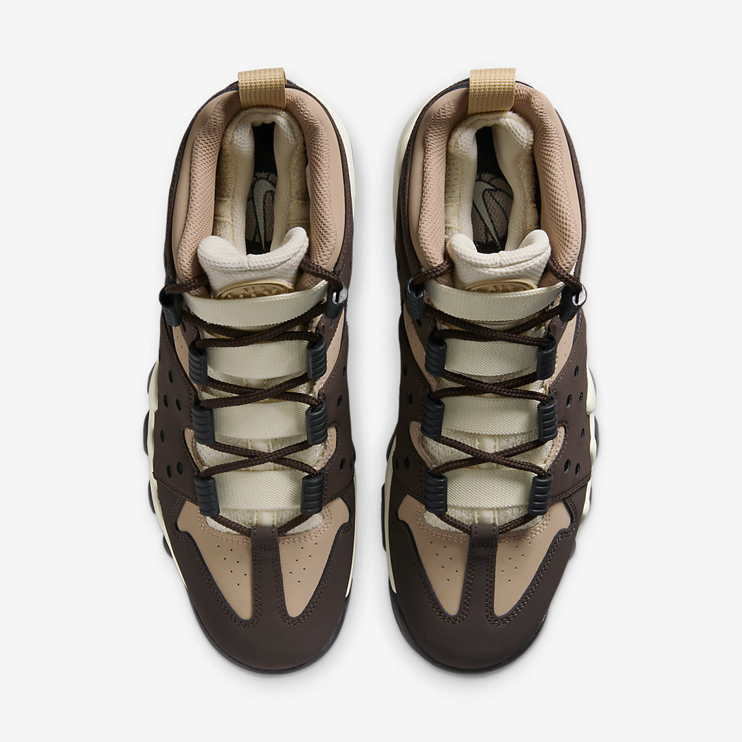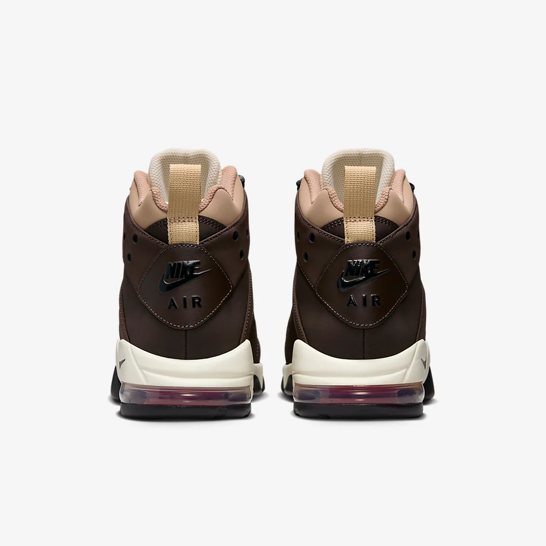 La tige s’articule entre marron foncé (comme une noix de coco) et beige tandis que la languette et la semelle intermédiaire ressortent d’un blanc nacré, couleur lait de coco. La semelle extérieure, le « Swoosh » et les inscriptions Nike sur l’empeigne et Nike Air sur le talon apparaissent en noir.