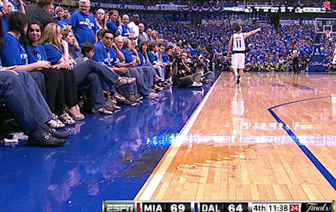 Sur l’action, JJ Barea est retombé sur une personne du premier rang, et un verre de soda a explosé sur le parquet.