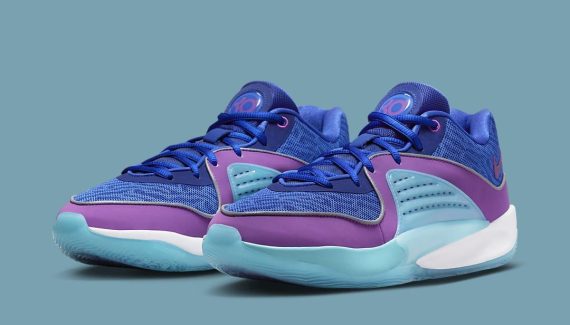 Le deuxième coloris “Ready Play” arbore pour sa part deux teintes de bleu, foncé sur le haut de la tige et plus clair au niveau de la semelle et du renfort latéral en TPU. Celles-ci sont séparées par une bande en daim violette, couleur qu’on retrouve aussi sur le logo du joueur sur la languette ainsi que sur le « Swoosh ». La semelle intermédiaire ressort en blanc. La semelle de la KD 16 est également dotée d’une unité Air Zoom à l’avant et Air Dot Weld Strobel sous le talon.