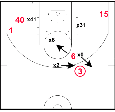 Le système commence alors que Dwyane Wade (#3) remonte la balle, après que le Heat a pris un temps mort. L’arrière All-Star se positionne en face du cercle, derrière la ligne des trois points. Ses intérieurs, Bosh (#1) et Haslem (#40), sont situés à gauche de la raquette; James (#6) et Chalmers (#15) sont à droite.