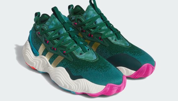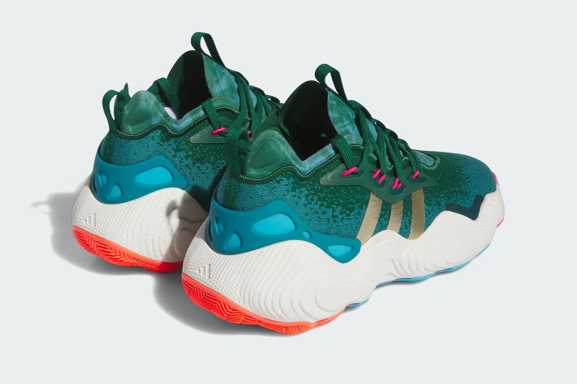 Sur cette nouvelle version de la 3e chaussure signature de Trae Young, on retrouve donc une tige allant du vert au bleu turquoise sur un dégradé en mode “pixelisé”. Les trois bandes de la marque adidas apparaissent en doré sur l’empeigne. Sous la grosse semelle intermédiaire “Boost” dont le design est inspiré de la claquette « Adilette 22 », on retrouve une semelle extérieure en rose, orange et bleu ciel. Les accroches des lacets ressortent également en rose.
