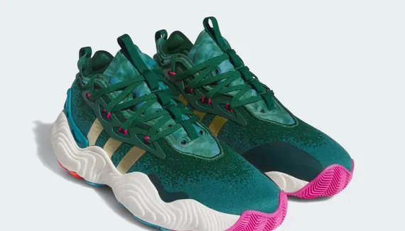 Sur cette nouvelle version de la 3e chaussure signature de Trae Young, on retrouve donc une tige allant du vert au bleu turquoise sur un dégradé en mode “pixelisé”. Les trois bandes de la marque adidas apparaissent en doré sur l'empeigne. Sous la grosse semelle intermédiaire “Boost” dont le design est inspiré de la claquette « Adilette 22 », on retrouve une semelle extérieure en rose, orange et bleu ciel. Les accroches des lacets ressortent également en rose.