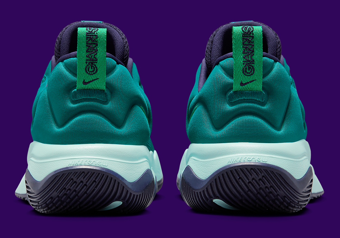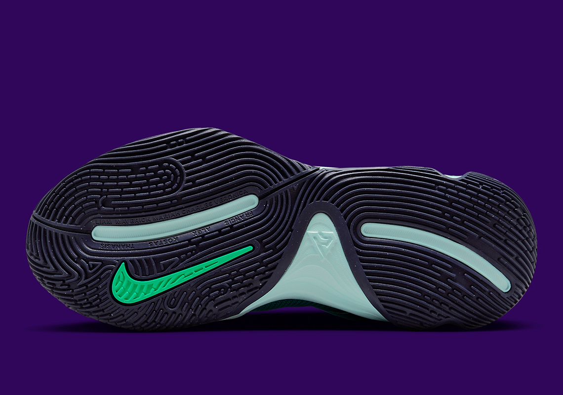 Au-delà de la tige couleur turquoise, il faut donc s’attarder sur les parties en violet, sur une partie de l’empeigne, de la languette et du col, ainsi qu’en vert sur les contours du “Swoosh” notamment et la tirette. La semelle intermédiaire en bleu clair repose sur une semelle extérieure ressortant également en violet, comme la couleur principale des maillots des Bucks dans les années 90.