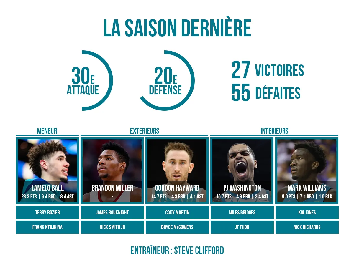 Tout ceci est-il vraiment suffisant pour faire mieux que la saison passée ? Logiquement, oui. Surtout que le retour de PJ Washington va faire du bien sous les panneaux, car le secteur intérieur reste faible. Mais est-ce assez pour être pleinement compétitif ? Là, c'est moins sûr. Pour ça, les hommes de Steve Clifford vont devoir notamment progresser offensivement. L'absence de Miles Bridges et les passages à l'infirmerie de Lonzo Ball n'ont évidemment pas aidé l'an passé, mais il va falloir être plus cohérent et efficace, sous peine de vivre une nouvelle saison galère.