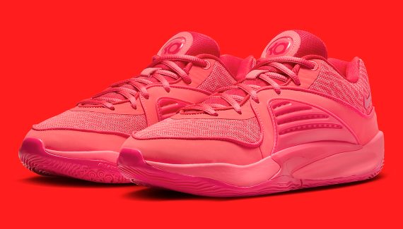 Cette KD 16 arbore un ensemble de tons en rouge pâle et rosé entre ses parties en mesh, en cuir et son bloc latéral en TPU sur l’empeigne. Le même habillage recouvre également la semelle. Sur le plan technique, la semelle de la KD 16 est dotée d’une unité Air Zoom à l’avant et Air Dot Weld Strobel sous le talon.