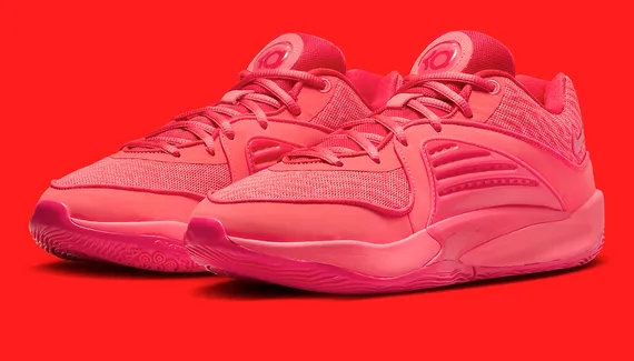 Cette KD 16 arbore un ensemble de tons en rouge pâle et rosé entre ses parties en mesh, en cuir et son bloc latéral en TPU sur l'empeigne. Le même habillage recouvre également la semelle. Sur le plan technique, la semelle de la KD 16 est dotée d’une unité Air Zoom à l’avant et Air Dot Weld Strobel sous le talon.