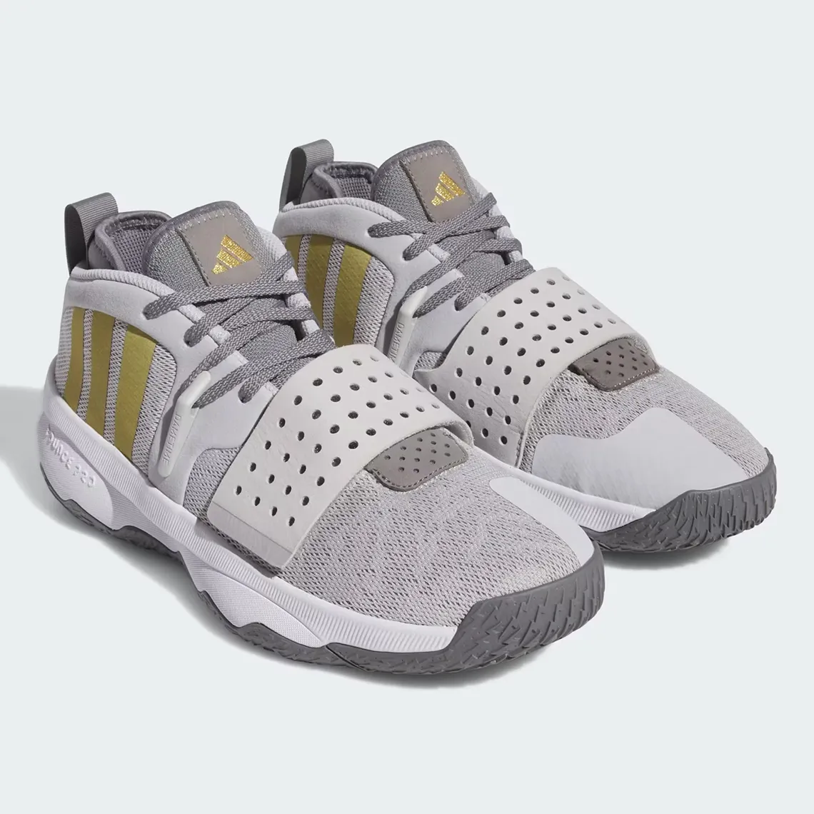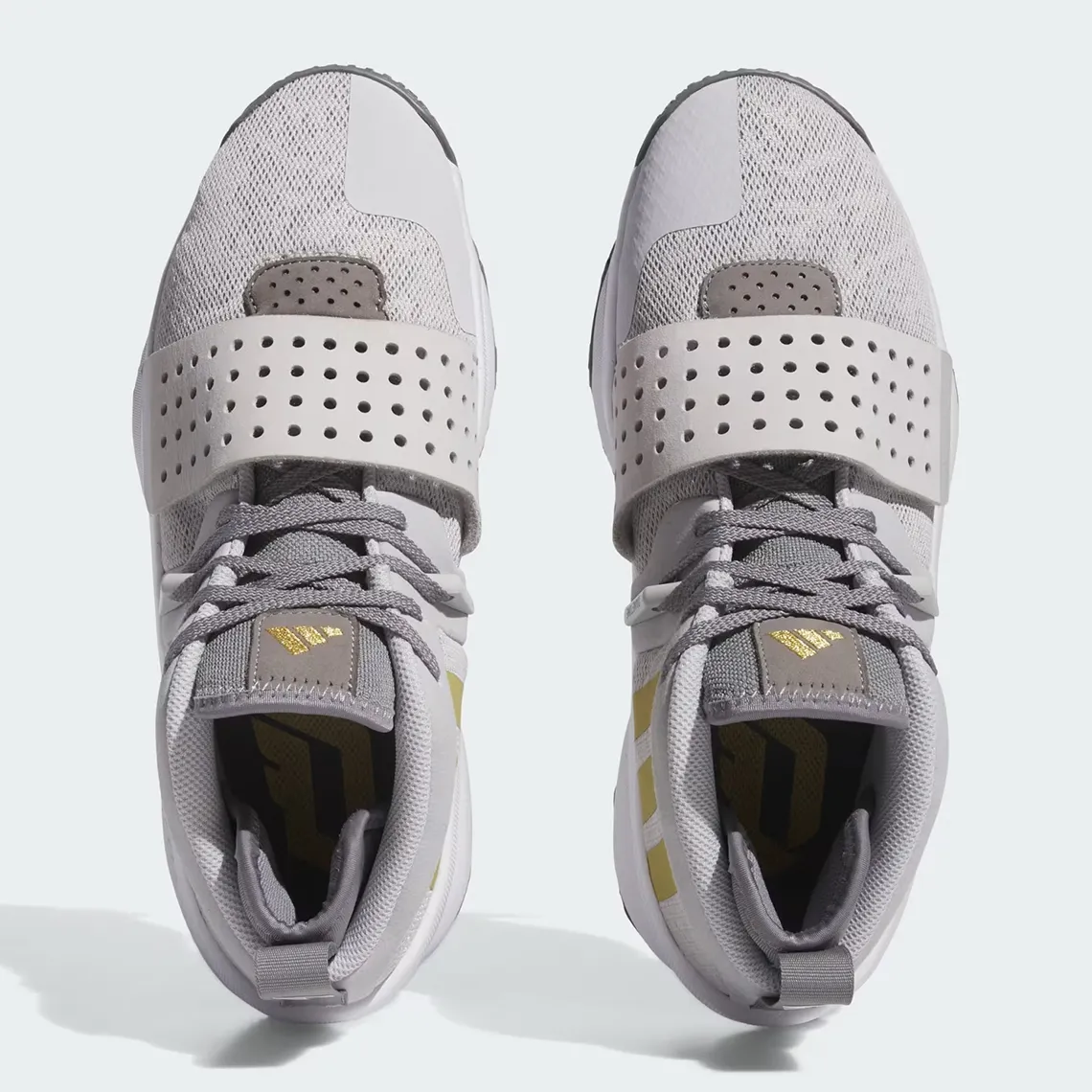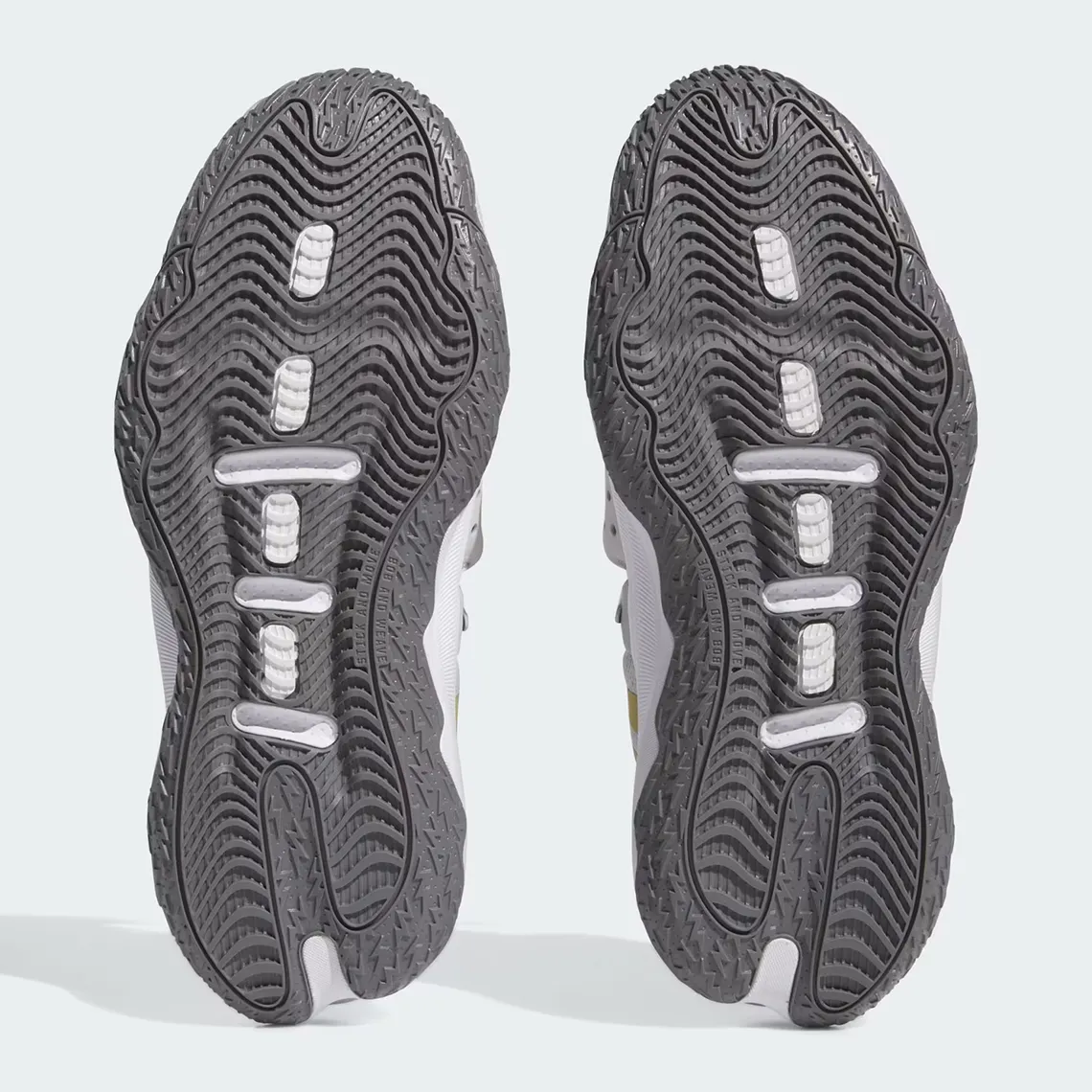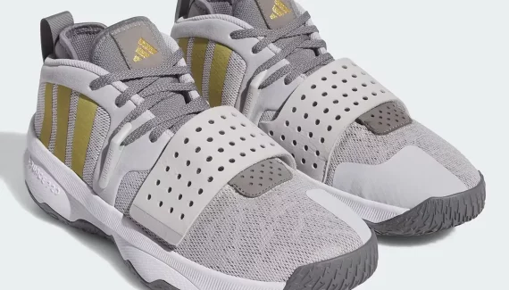 En attendant une version aux couleurs des Bucks, cette mouture ressort principalement sous différentes teintes de gris pour habiller sa tige et sa semelle, complétée par du blanc au niveau intermédiaire. On constate toutefois l’apparition de finitions dans un jaune pâle-doré, au niveau des trois bandes présentes sur les parties latérales ainsi que sur la la languette.
