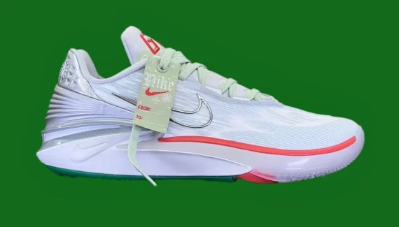 Baptisée « Christmas », elle est composée d’une empeigne blanche avec de fines touches de violet, des teintes de vert et des bandes en rouge pour illustrer le thème de Noël. On retrouve également des motifs flocons de neige pour accompagner le talon en satin. À noter également l’amorti Air Zoom Strobel ainsi qu’une unité Zoom Air au niveau du talon pour compléter une semelle extérieure semi-transparente.