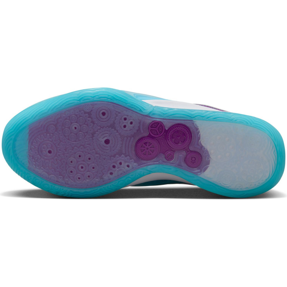 Le jeu offensif de Kevin Durant relève d’une certaine dimension artistique, et les finitions de la KD 16 sont notamment là pour l’illustrer. On commence par la plaque rigide sous le milieu du pied, illustrée de motifs d’engrenages similaires à ceux d’une montre, censés représenter la « nature méthodique » de KD. Ces motifs sont également présents sur la boîte de la paire.