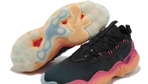 Pour cette deuxième version, la Trae 3 est habillée de noir, de rose et d'orange, avec du noir sur la partie supérieure de la tige, puis une strate de rose et une autre plus orangée. Inspirée de l'Adilette 22, la semelle ressort de plusieurs couleurs. Pourquoi ces teintes ? C'est pour illustrer le “jeu futuriste” du meneur des Hawks.