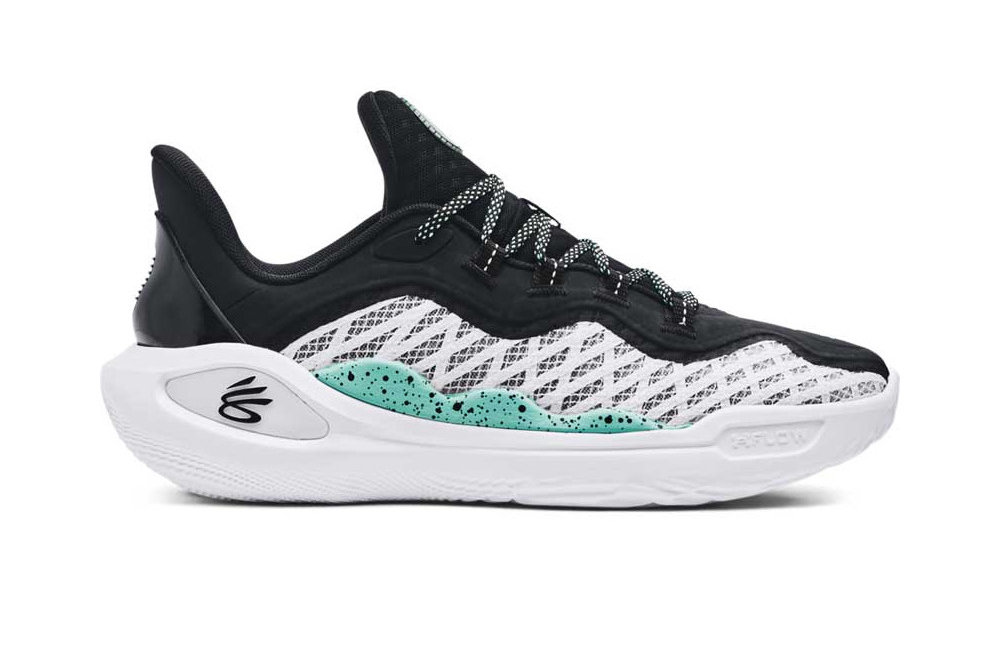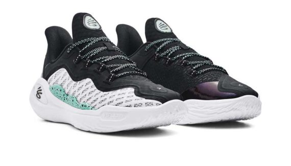 Pour ce premier coloris, Under Armour a dévoilé la version « Futur Curry » avec une tige en noir et blanc complétée de finitions en bleu clair. On reste sur du Low Top mais avec pas mal de nouveautés toutefois niveau design et composition.