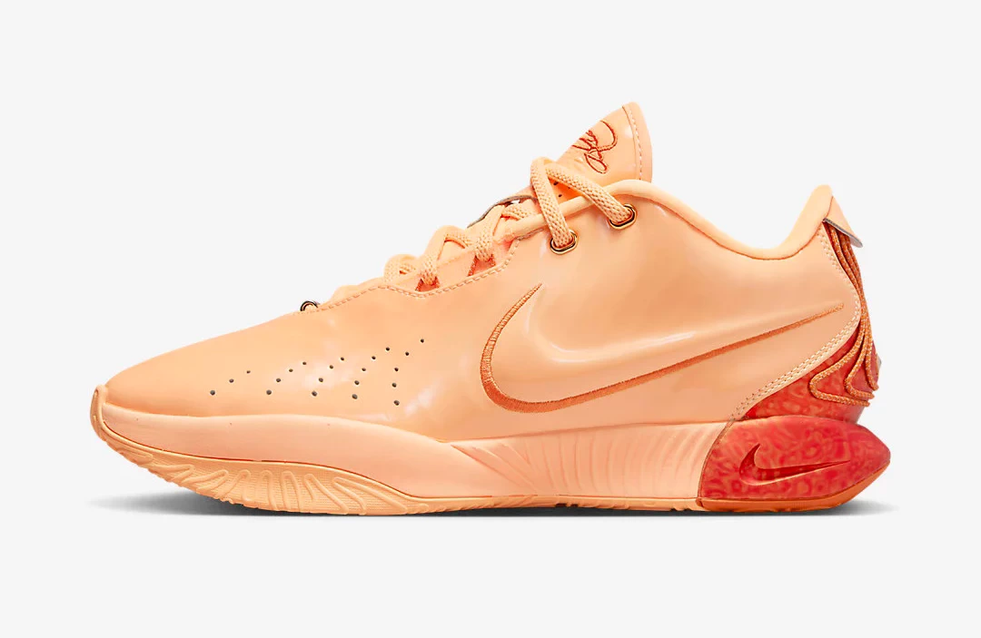 D’inspiration asiatique, continent sur lequel le dragon fait partie de la culture mystique, ce modèle arbore une tige couleur saumon, avec des notes d’orange plus foncé, pour faire ressortir les contours du “Swoosh” ou au niveau du talon, ou des câbles zonaux à 360 degrés entourent une “perle” sur laquelle on distingue le 21 en chiffres romains (XX-I).