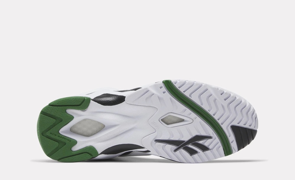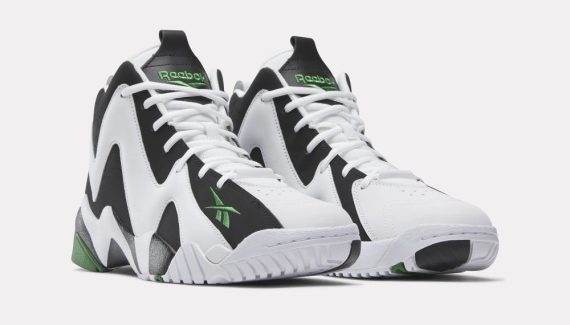 Cette version top en noir et blanc se distingue ici par quelques notes de vert en clin d’oeil aux couleurs des SuperSonics de Seattle, l’équipe où évoluait Shawn Kemp à l’époque. On en retrouve notamment sur la base arrière de la semelle ainsi que sur les finitions comme le logo Reebok sur l’avant du pied ou sur la languette.