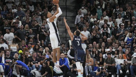 Un alley-oop de Devin Vassell en sortie de temps-mort, un 3-points face à Dereck Lively II en sortie de dribble, une prise de position rapide avec la faute, puis un tir poste bas face à Grant Williams.