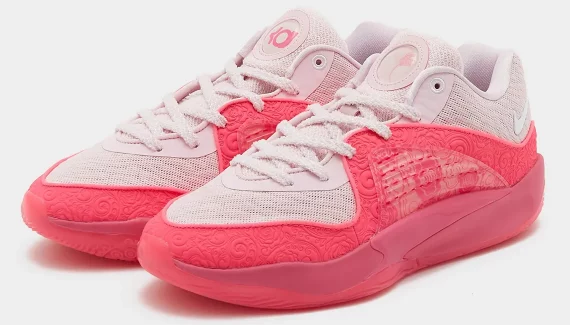 C’est désormais une tradition qui se poursuit depuis onze ans, à l’époque de la KD 4, et qui sera encore au rendez-vous cette saison. Sur cette KD 16, on peut distinguer une tige en deux teintes de rose, avec des motifs floraux à la base et sur l’empeigne.