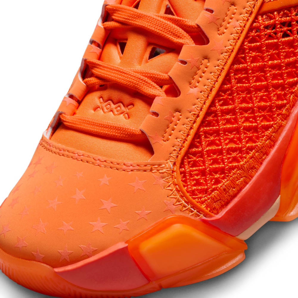 Certains motifs peuvent évoluer selon les coloris, également très originaux, comme ce modèle “WNBA” en orange sur lequel le logo de la ligue féminine apparaît sur l’une des languettes. Si la tige n’est plus en mesh tissé comme sur les AJ 36 et 37 l’empeigne conserve une partie en mesh tricoté pour assurer une bonne aération. C’est sans doute un meilleur compromis.