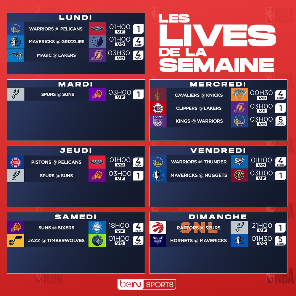 Phoenix qui, comme Dallas et Golden State, sera diffusé à trois reprises cette semaine. On suivra également de près le derby de Los Angeles, les retrouvailles Knicks – Cavaliers, Warriors – Kings et Rudy Gobert – Jazz, ainsi que le duel entre Nikola Jokic et Luka Doncic ou celui entre Joel Embiid et Kevin Durant.