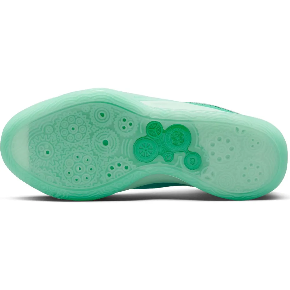 Celle-ci se présente avec une tige articulée autour de ses couleurs préférées, à savoir différentes teintes de vert, et agrémentée de renforts latéraux en TPU en bleu ciel. Les finitions apparaissent en doré et blanc tandis que le col ressort dans un motif blanc, doré et vert.