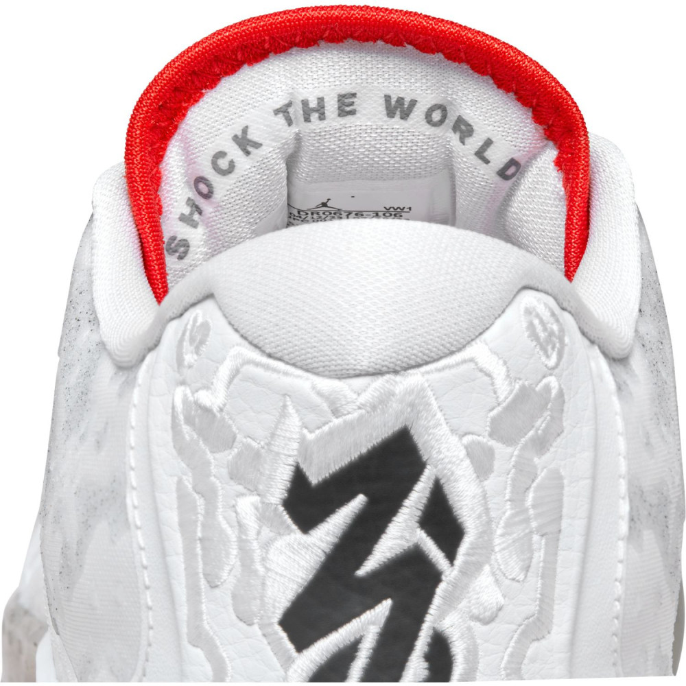 Pour cette dernière mouture baptisée « Fresh Paint », Jordan Brand est parti sur du classique avec un brin d’inspiration « Made in Chicago ». La tige principalement blanche est ici complétée de finitions en noir, comme sur le logo « Zion » sur le talon, et rouge », au niveau de la languette notamment. L’ensemble repose sur une semelle extérieure beige translucide tachetée de noir.