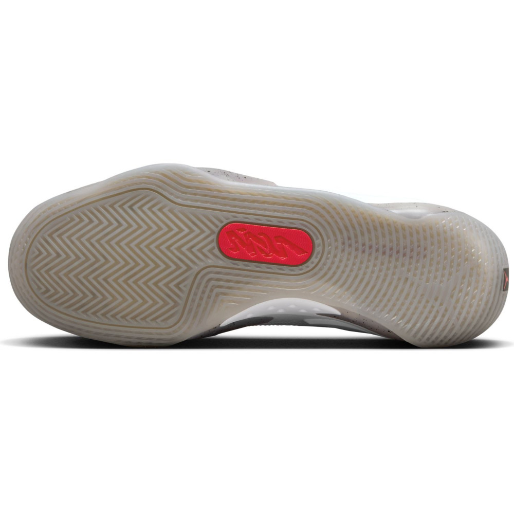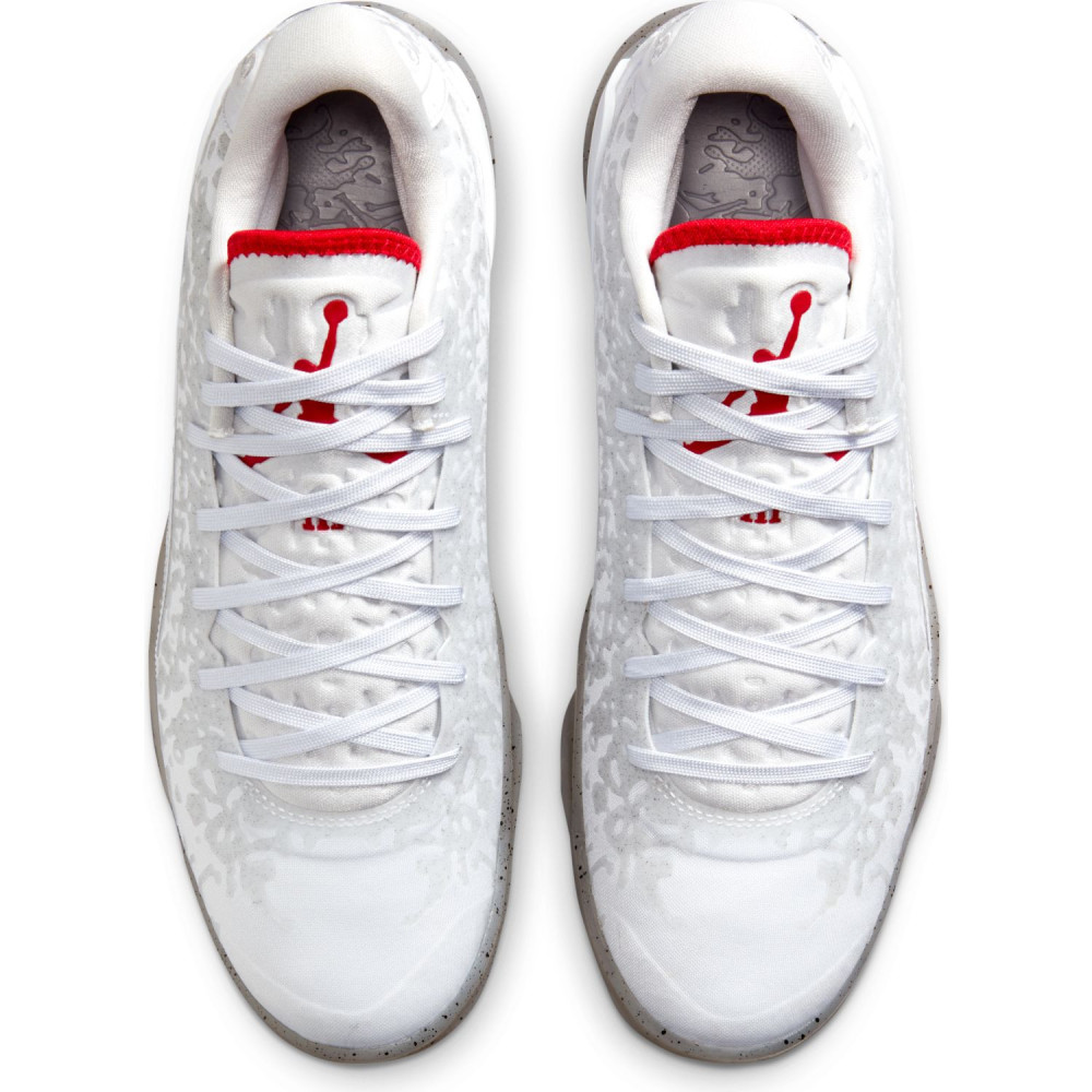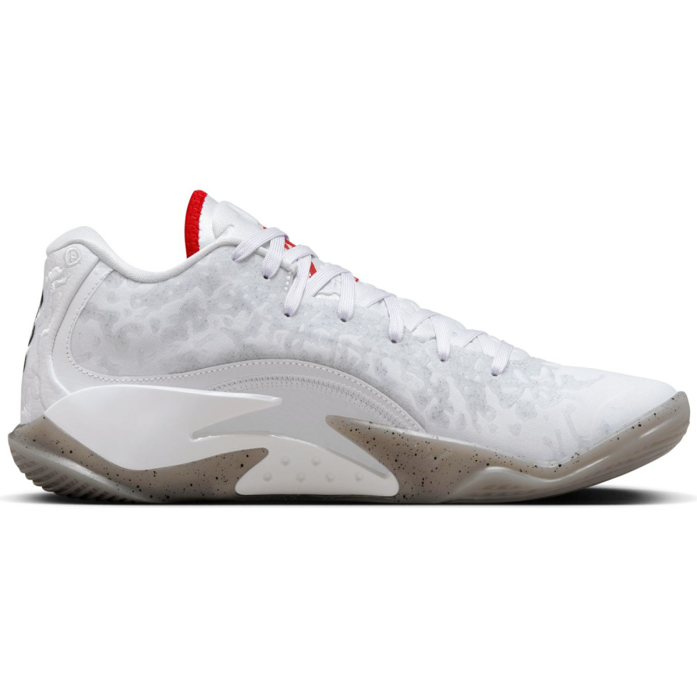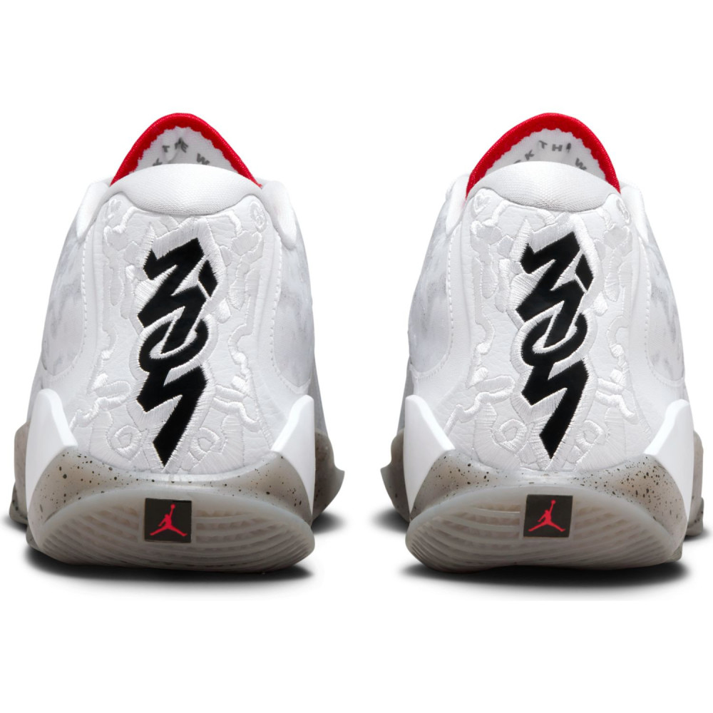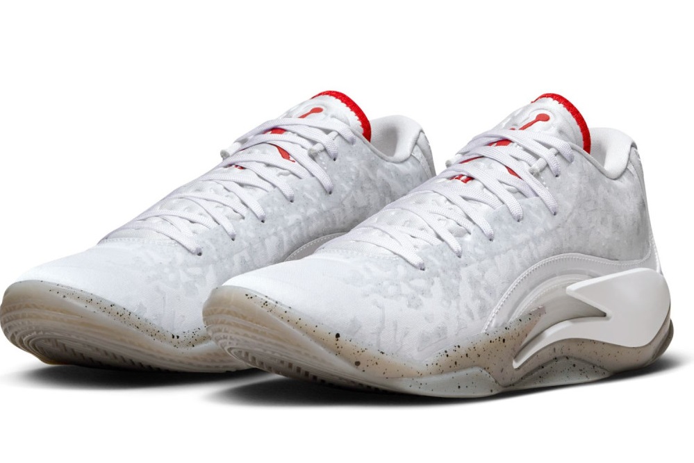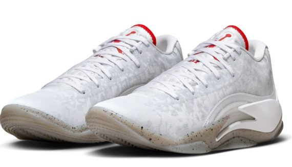 Pour cette dernière mouture baptisée « Fresh Paint », Jordan Brand est parti sur du classique avec un brin d’inspiration « Made in Chicago ». La tige principalement blanche est ici complétée de finitions en noir, comme sur le logo « Zion » sur le talon, et rouge », au niveau de la languette notamment. L’ensemble repose sur une semelle extérieure beige translucide tachetée de noir.