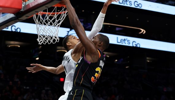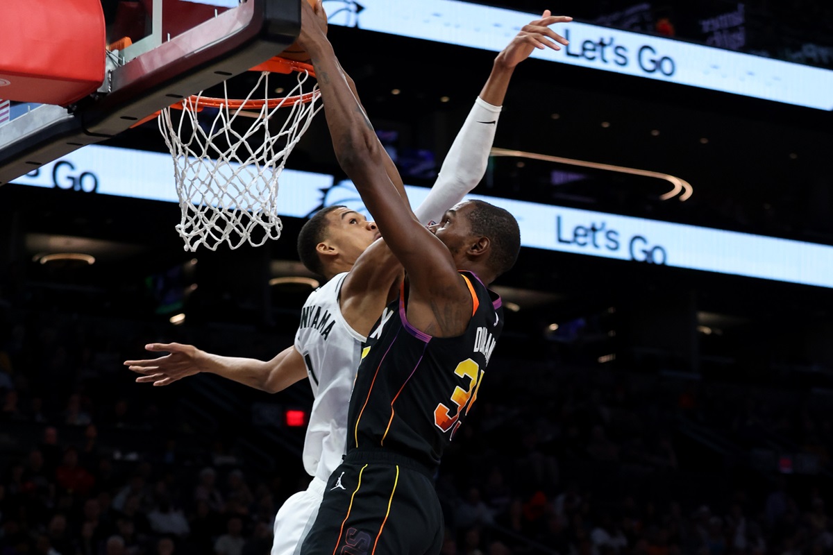 Kevin Durant est passé au-dessus de Victor Wembanyama deux fois. Avec finesse pour un shoot à mi-distance au buzzer des 24 secondes, puis surtout avec un dunk à deux mains. Le Français a bien répondu, sur la même séquence, avec un gros poster main gauche sur Drew Eubanks.
