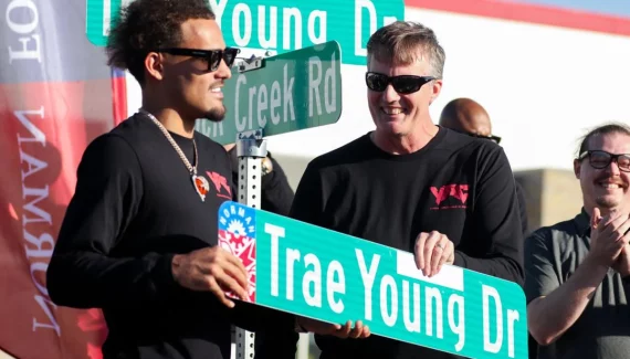 Pour sa venue, sous les yeux de ses parents et ses frère et soeurs, de tous ses coéquipiers et du consultant (et légende) du club, Dominique Wilkins, le maire Larry Heikkila a décidé d’inaugurer une rue à son nom, la “Trae Young Drive” en face du complexe sportif qu’il fait construire (le Young Family Athletic Center) et qui devrait ouvrir ses portes en janvier 2024.