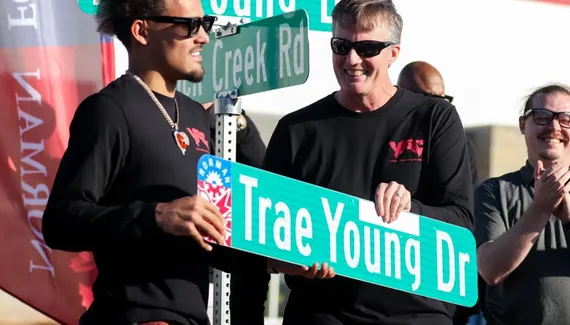 Pour sa venue, sous les yeux de ses parents et ses frère et soeurs, de tous ses coéquipiers et du consultant (et légende) du club, Dominique Wilkins, le maire Larry Heikkila a décidé d'inaugurer une rue à son nom, la “Trae Young Drive” en face du complexe sportif qu'il fait construire (le Young Family Athletic Center) et qui devrait ouvrir ses portes en janvier 2024.