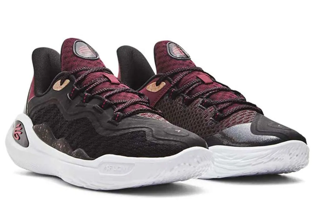 Après la version « bouchon de liège » de la Curry 10, Under Armour a présenté sa Curry 11 « Domaine ». Avec une tige entre noir et bordeaux, celle-ci se démarque notamment par un plus petit motif couleur liège sur le dernier œillet. L'ensemble repose sur une semelle UA Flow blanche sur laquelle le logo de Stephen Curry ressort également couleur bordeaux.