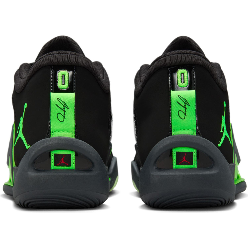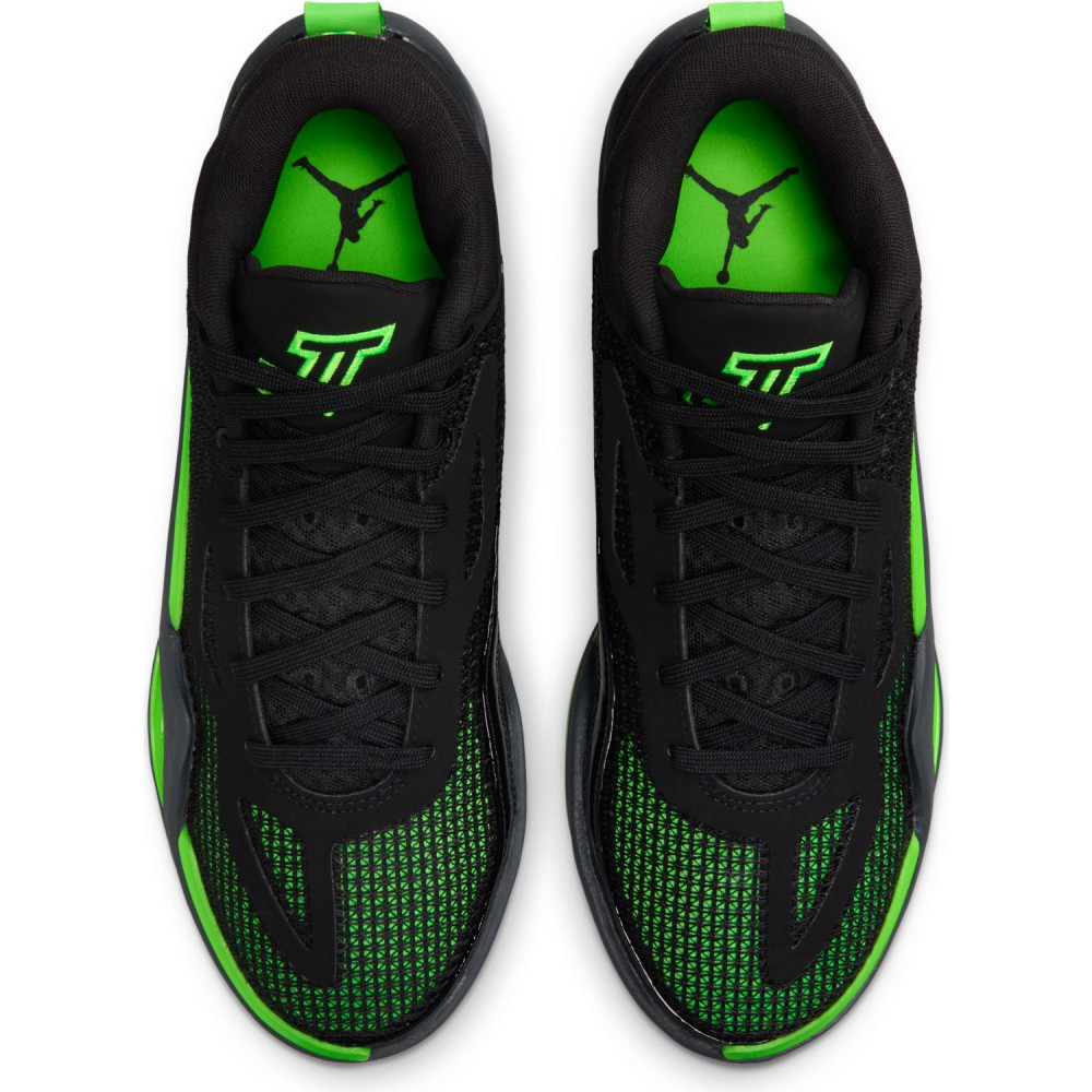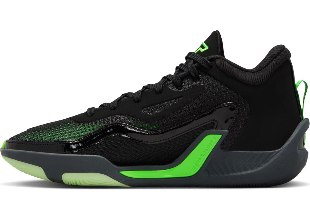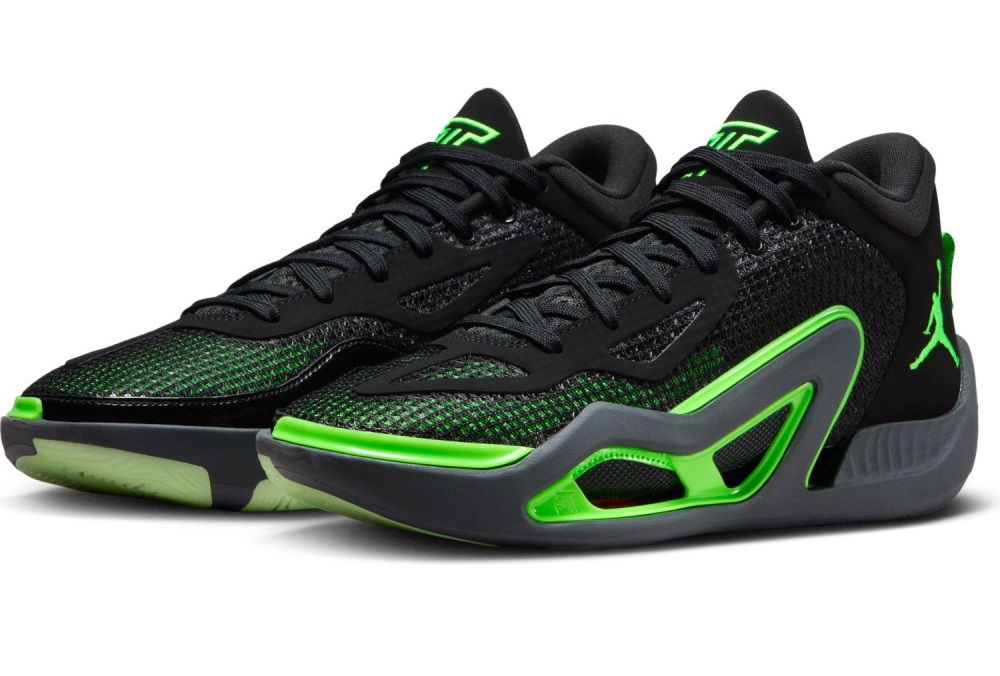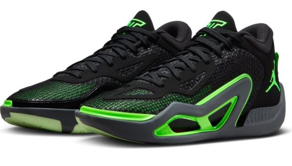 Ce nouveau coloris se présente avec une tige principalement noire assortie de touches vertes, la couleur principale de l’équipe de Boston. On en retrouve notamment sur l’avant du pied, au niveau de la semelle mais aussi sur le « Jumpman » ressortant sur la malléole ou les contours du logo « JT » présent sur la languette.
