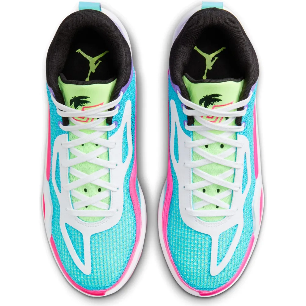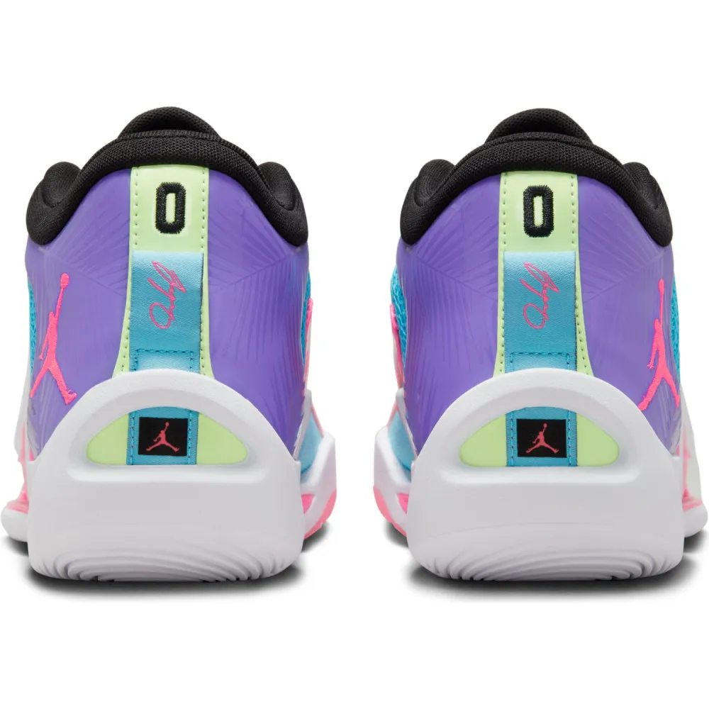On y retrouve une tige entre bleu ciel sur la partie avant, violet à l'arrière, avec des touches de vert pâle sur la languette et le talon tandis que le col ressort en noir. La semelle s'articule entre blanc et rose. Le rose apparaît également sur différentes finitions, comme le logo « Jumpman », la signature du ou le logo du Jayson Tatum.