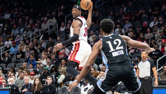 Résultat : après douze minutes, les Hawks sont relégués à 17 points, et l’écart va même dépasser les 20 points en première mi-temps. Deux joueurs crèvent l’écran : Bam Adebayo, qui donne une leçon de tirs en cloche au-dessus des bras de Clint Capela et des autres grands d’Atlanta, et Jaime Jaquez, hyper agressif, qu’il s’agisse d’attaquer le cercle ou d’envoyer Bogdan Bogdanovic sur les fesses après un “cross”. À la pause, Miami mène encore de 11 points (63-52) après un 3-points au buzzer de ce même Jaquez.