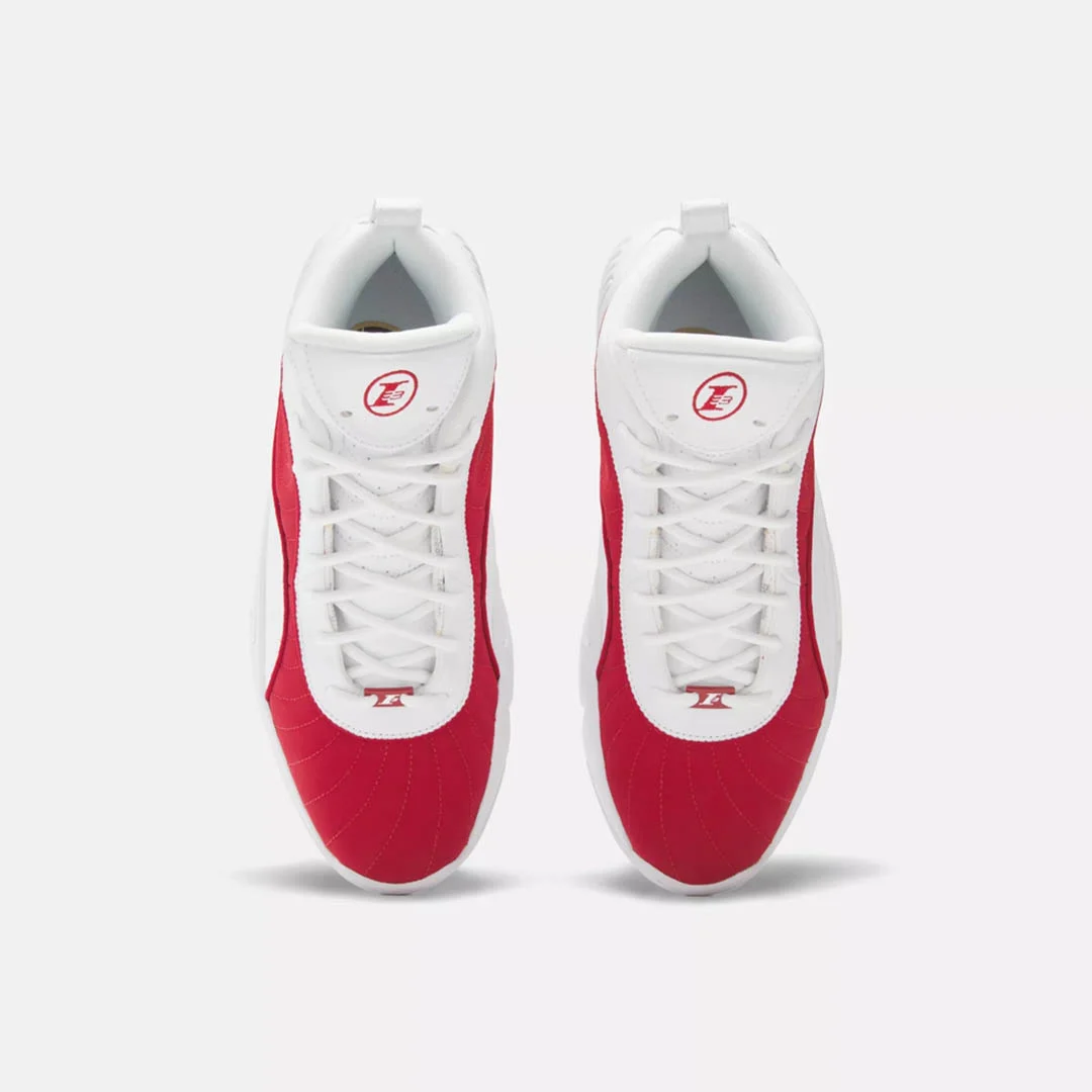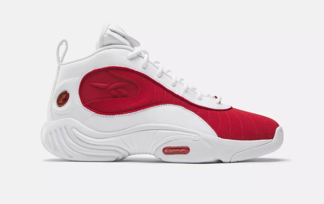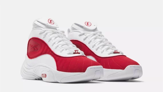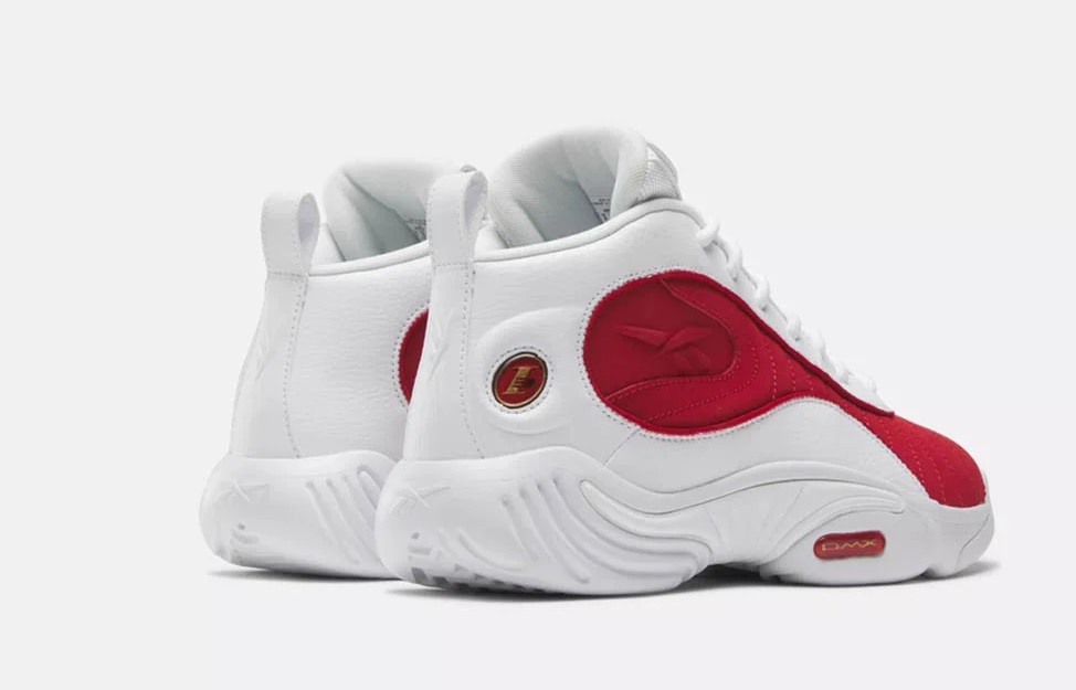 Celui-ci se présente avec une tige en cuir blanc et une couche de rouge recouvrant l’avant et une partie de l’empeigne, sur laquelle ressort le logo de la marque Reebok. La pastille sur laquelle on retrouve le logo “I3” du joueur est également présente, en noir et doré. Le logo apparaît également en rouge et blanc sur la languette. L’ensemble repose sur une semelle blanche avec notamment la mousse DMX de l’époque en guise de semelle intermédiaire.